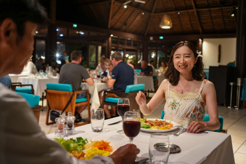 Le restaurant la Pirogue est ouvert pour le petit-déjeuner, le déjeuner et le dîner, dans un cadre unique face à la baie d’Oro. Entre produits du lagon et inspirations contemporaines, chaque repas devient un moment aussi élégant que dépaysant.